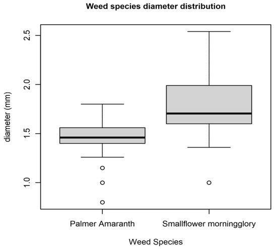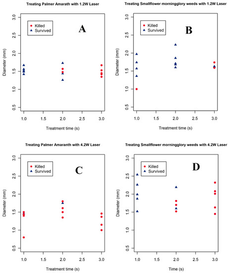 Results shown in Figure 7 and Table 2 demonstrate only 15% of the weeds were killed using 1.2 W laser when treated for 1 s and 2 s, while 70% of the weeds were killed when treated for 3 s. The 4.2 W laser killed 40% of weeds when treated for 1 s, 70% of weeds when treated for 2 s, and 100% when treated for 3 s. The laser power, diameter of the stem, and treatment duration were all significant, while the weed species was not significant. Diameter of the stem played a significant role in determining whether the weed was killed or survived, that is, Palmer amaranth was killed more than small flower morningglory because of the overall lower average stem diameter as demonstrated in Figure 8. Some treated weeds were not killed but appeared to have stagnated in their growth and some slightly wilted.