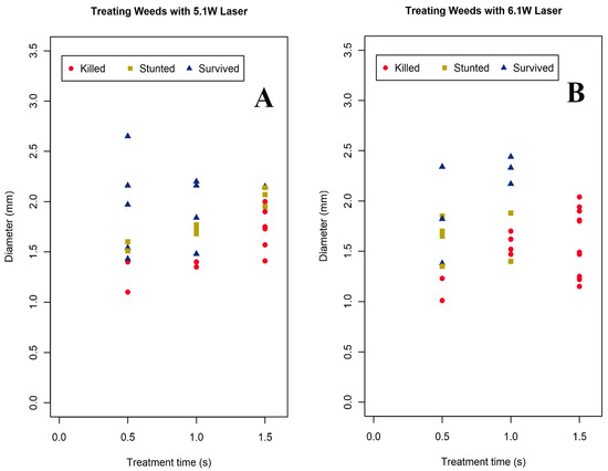 Status of weeds after 1 week of monitoring. (A) using 5.1 W laser, (B) using 6.1 W laser.