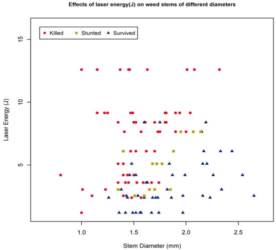 Using the data from experiment 2 and experiment 3, Figure 10 demonstrates the effect of laser energy (J) which is a product of laser power (W) and the treatment time (s) to the weeds of different diameters. Most of weeds which were exposed to high energy were killed, but as the energy goes down, the effect of diameter become more prevalent.