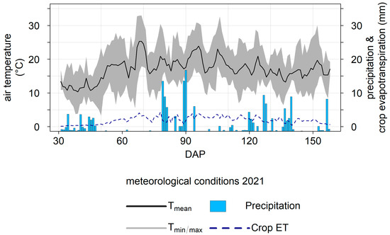 Measured agrometeorological data during the 2021 growing season (12 May 2021, until 16 September 2021): DAP = days after planting; Tmean = mean daily air temperature (°C); Tmin = minimum daily air temperature (°C); Tmax = maximum daily air temperature (°C); Crop ET = in situ derived crop evapotranspiration (mm) determined based on the energy budget on the site according to the FAO crop evapotranspiration [40]. Crops were planted on 15 April 2021. Data were measured in four replicates on the study site and validated using a nearby climate station. Measurement devices were installed over the entire irrigation lane on 5 May 2021 (20 DAP) and uninstalled on 16 September 2021 (154 DAP).