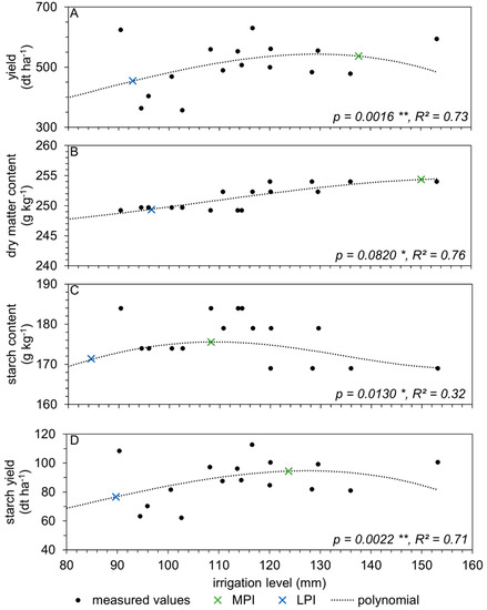 Yield and tuber quality of each harvest parcel (four harvest parcels per test plot) as a function of the irrigation level (mm). (A): total yield (dt ha−1); (B): dry matter content (g kg−1); (C): final starch content (g kg−1); (D): total starch yield (dt ha−1). Green dashed lines indicate the maximum profitable irrigation level (MPI). Blue dashed lines indicate the lowest profitable irrigation level (LPI), with regard to tuber quality thresholds. Level of statistical significance of each polynomial is indicated by * p ≤ 0.05, ** p ≤ 0.01. According to the polynomial order, there are local minima at higher irrigation levels than the MPI. These were not used for the LPI, as it must be lower than the MPI.