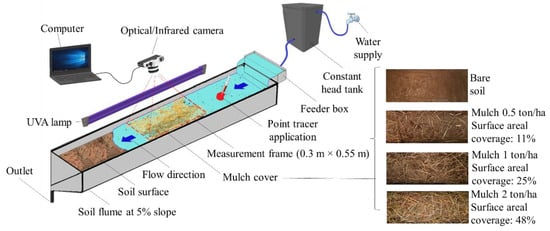 Schematic representation (not to scale) of the laboratory soil flume setup for measuring sheet flow velocities using fluorescent quinine, dye, and thermal tracers. The measuring frame is 0.30 m × 0.55 m. Sample views of the tested bare and mulched soil surfaces are also shown.