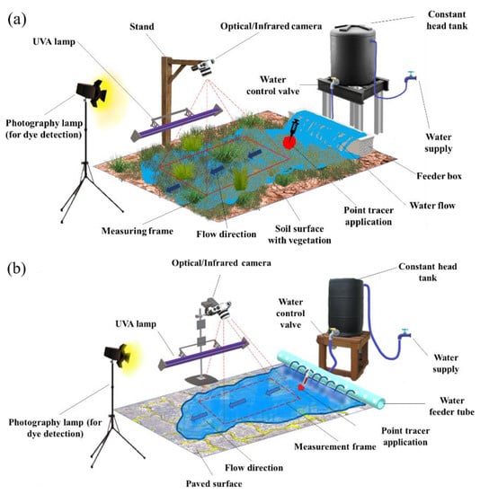 A schematic representation of the laboratory experimental setup used for estimating sheet flow velocities based on different liquid tracers is shown in Figure 1.