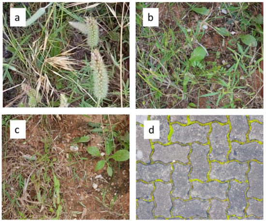 Surfaces tested in the field: vegetated soil surface with (a) vegetation with an average height of 0.15 m, (b) vegetation with an average height of 0.1 m, (c) vegetation with an average height of 0.05 m and (d) paved surface.