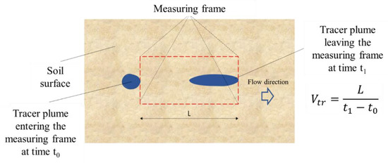 Sketch of the one-step method of estimating the tracer leading edge velocity Vtr of surface flow over the distance L. This sketch superimposes the two snapshot images that correspond to the tracer’s plume leading edge entering and leaving the measuring frame and identifies the time lapse between them (t1 − t0).