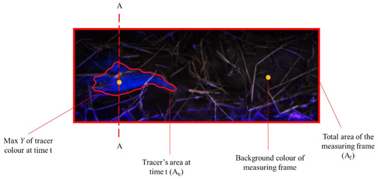 Figure 6 illustrates the definition of the total area of the measuring frame (AT), the tracer’s plume area at each time step (Atr), the background colour (for the estimation of average relative luminance Y2 of the background colour) within the measuring frame, and the cross-section A–A that was used to study the Y of the tracer (quinine and dye) along a transect transversal to the flow direction. In general, the cross-section A–A is associated with the pixel that exhibits the highest tracer Y at each time step; the contrast ratio of the tracer (quinine and dye) is also determined for the same cross-section. This study considered a time step Δt = 1 s for selecting images that show the movement of the tracers.