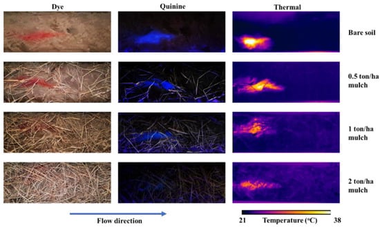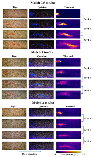 Examples of chronological sequences of images (time lapse of 1 s) of the measuring frame showing the movement of the different tracers are presented in Figure 8. All mulch soil cover levels tested are represented in Figure 8. The thermal tracer leading edge movement is better shaped in all mulch cover levels when compared to the other tracers. For the soil surface mulch cover level of 2 ton/ha, the dye and the quinine tracers did not show reliable results (due to poor visibility of the tracers caused by the presence of the mulch) for estimating flow velocities over the soil surface. However, the quinine tracer plume leading edge movement is better defined and better shaped compared to the dye tracer plume, and the tracer does not leave any mark or residue in the measuring frame. In the images captured for the quinine tracer, despite the dark environment (Section 2), the mulch can be clearly seen, which is due to the fluorescent light reflection over the wet mulch.