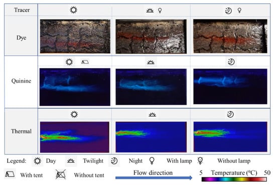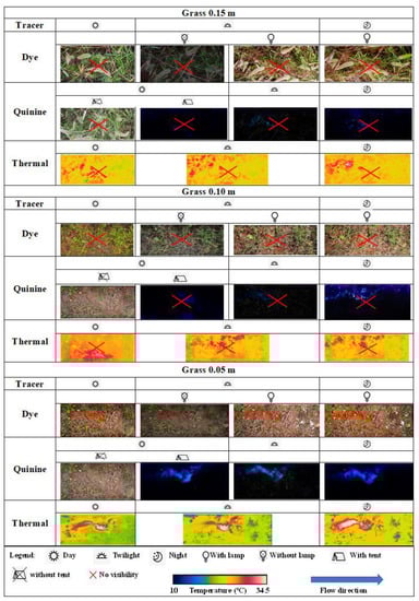 For the vegetated surfaces with high (i.e., taller) vegetation cover (height of 0.15 and 0.10 m), neither of the tracers were clearly visible. The reason is because the dye and quinine tracers hide under dense vegetation canopies and shades and could not be captured by the cameras. Additionally, the thermal tracer (hot water) is not traceable under tall vegetation covers because the infrared camera detects instead the temperature of the grass/vegetation covering on the surface and flow water. However, over the soil covered by vegetation of 0.05 m of height and over paved surfaces all tracers were visible. By comparing the tracers in different light conditions, it can be stated that: (i) during the day, the quinine can only be seen if the ambient light is dimmed (e.g., if a removable tent is used to conduct the observations) and UVA light is available; (ii) the dye is well observed during the day whereas during the twilight and night time it is necessary to use artificial lighting systems; (iii) the thermal tracer has no lighting restrictions and can be used during day or night.