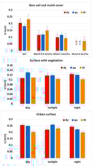 For all surfaces (bare, mulched and vegetated soil, and paved surface), and for comparable light conditions, flow discharge and volume of tracer used, Figure 11 shows that the mean velocities (U), estimated by all tracer techniques (dye, quinine and thermal), are similar. Nevertheless, our results suggest that, overall, by increasing the amount of mulch (from bare soil up to 2 ton/ha of mulch), the overland flow velocities decreased. This is because, for the sheet flow depths observed, the hydraulic roughness increases with increasing mulch density, which leads to lower velocities. For the mulch cover of 2 ton/ha, the dye and quinine tracers were not visible; therefore, data (n.d.) are not available for this case.
