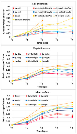 To further explore the outcomes from the different tracer experiments, the areal coverage of each tracer’s plume within the measuring frame (horizontal projection; see Figure 5 and Figure 6) was plotted over time, for time steps Δt = 1 s (Figure 12). In Figure 12, the results for each surface type/condition are plotted separately, to facilitate the comparison of results between the different tracers.