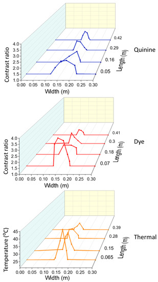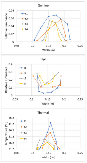 For the mulch surface cover of 0.5 ton/ha, Figure 13 shows plots of the relative luminance for the quinine and dye tracer and the temperature variation for the thermal tracer, at each time step Δt = 1 s, along the width of the measuring frame. As shown in Figure 6 and using Equations (5)–(8), at each time step Δt, the maximum relative luminance was detected, and the relative luminance (Y) along the defined cross-section was able to be plotted.
