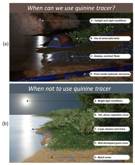 For surface flow velocity estimates: (a) favourable conditions for using the fluorescent quinine tracer technique in the field; and (b) conditions preventing the use of the quinine technique in the field.