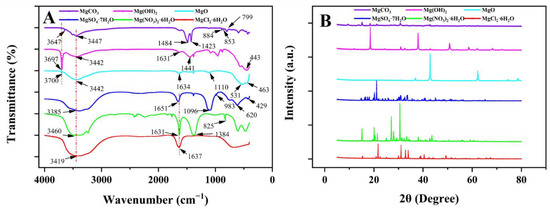 Characterization of various types of Mg fertilizer; (A) FTIR spectra of different Mg fertilizers; (B) XRD patterns of different Mg fertilizers.