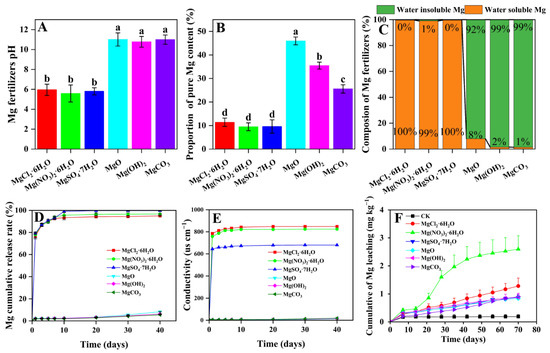 Characteristics of various types of Mg fertilizers; (A) pH of different Mg fertilizers; (B) proportion of pure Mg content in Mg fertilizers; (C) proportion of water−soluble Mg in Mg fertilizers; (D) release curves of different Mg fertilizers at 25 °C in water; (E) conductivity of different Mg fertilizers in water; (F) leaching accumulation rate of different Mg fertilizers over 70 days. Different lowercase letters show significant differences among different Mg fertilizers using a Duncan test (p < 0.05).
