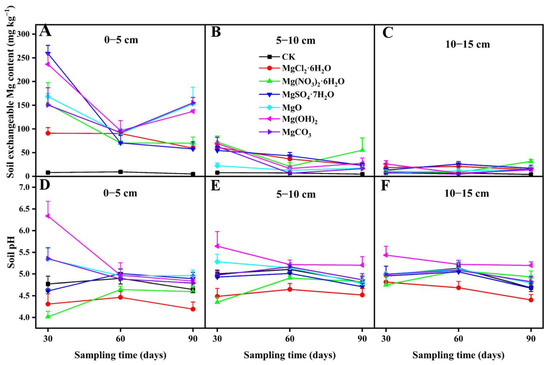 The transformation process of the soil exchangeable Mg and pH under different Mg fertilizer treatments; (A) exchangeable Mg content of 0–5 cm layer soil under different Mg fertilizer treatments; (B) exchangeable Mg content of 5–10 cm soil layer under different Mg fertilizer treatments; (C) exchangeable Mg content of 10–15 cm layer soil under different Mg fertilizer treatments; (D) soil pH of 0–5 cm layer soil under different Mg fertilizer treatments; (E) soil pH of 5–10 cm layer soil under different Mg fertilizer treatments; (F) soil pH of 10–15 cm layer soil under different Mg fertilizer treatments.