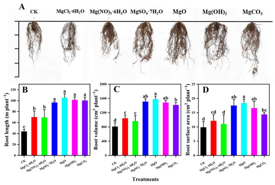 Effects of different types of Mg fertilizer on soybean growth at maturity for; (A) root growth; (B) root length; (C) root volume; (D) root surface area. The different lowercase letters show significant differences among different Mg fertilizers using a Duncan test (p < 0.05).