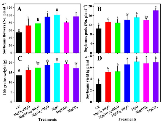 Effects of various types of Mg fertilizer on soybean yield and yield-related indicators; (A) number of flowers per plant; (B) number of pods per plant; (C) 100–seed weight; (D) yield per plant. Different lowercase letters show significant differences among the different Mg fertilizers with a Duncan test (p < 0.05).