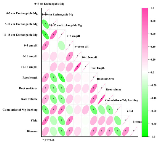 Correlation analysis showed that under a 0–5 cm soil layer, the exchangeable Mg was positively correlated (p < 0.05) with soybean yield. The soybean yield was positively correlated (p < 0.05) with the 0–5 cm soil pH and biomass. Mg leaching accumulation was negatively correlated (p < 0.05) with 0–5 cm soil exchangeable Mg and soybean yield (Figure 7).