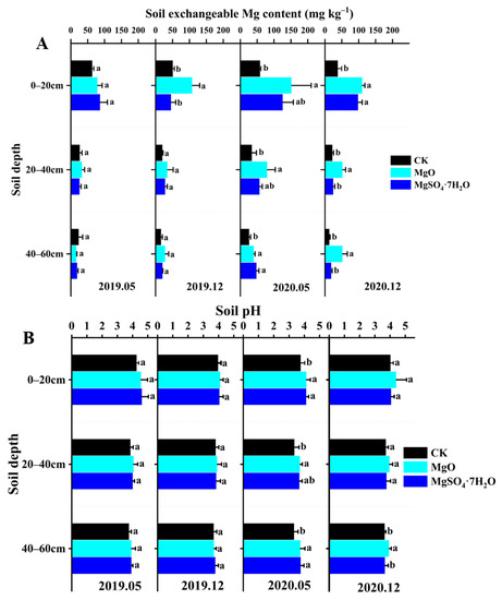 Effects of various types of Mg fertilizers on soil exchangeable Mg and pH with over time; (A) exchangeable Mg content of 0–20, 20–40, and 40–60 cm layer soils under different Mg fertilizer treatments; (B) soil pH of 0–20, 20–40, and 40–60 cm layer soils under different Mg fertilizer treatments. Different lowercase letters show significant differences among different Mg fertilizers using a Duncan test (p < 0.05).