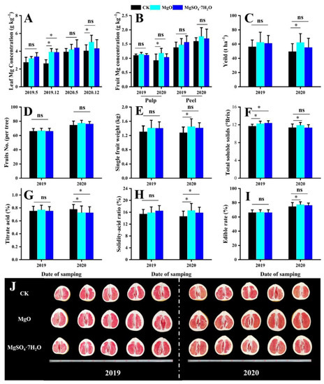 Effects of different Mg fertilizers on various pomelo plant indexes; (A) leaf-Mg contents; (B) pulp and peel Mg contents; (C) pomelo yield; (D) number of fruits per plant; (E) single fruit weight; (F) total soluble solids; (G) titratable acid; (H) solidity-acid ratio; (I) edible rate; (J) slitting-cut fruit diameters. * shows significant differences among different Mg fertilizers with a Duncan test (p < 0.05), while ns represents non-significant differences.