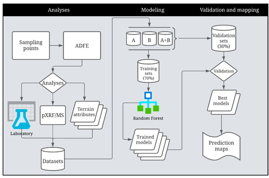 The best prediction models for available B, Cu, Fe, Mn, Zn, and clay, silt, and sand fraction contents were used for spatial prediction throughout the study area. Since pXRF and MS data are point-based information (39 sampled locations), the multilevel B-splines interpolation method was applied [55] to make these variables continuously represented across the area. For this process, the data were imported into SAGA GIS, and the function “Multilevel B-splines” was applied. The values of the spatialized data were processed and extracted as a table containing their latitude/longitude information using ArcMap (10.1). Values of the predictor variables for the entire farm area were applied to the RF model created in R Studio (version 2022.07.01), generating the spatial prediction of the target soil attributes across the study area. Figure 2 presents a flowchart summarizing all the steps of this study.