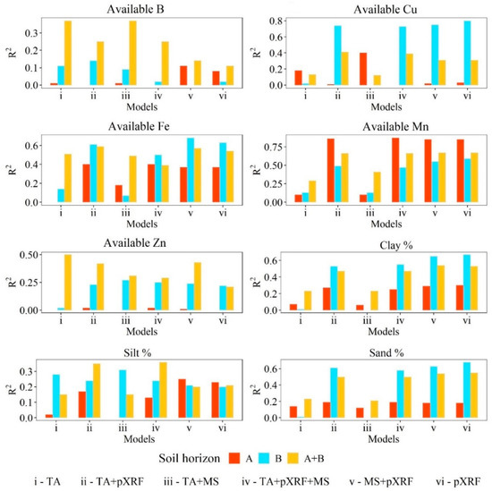 The different datasets grouped per soil horizons (A, B, or A + B) delivered variable results also depending on the prediction variables selected. For instance, using only pXRF data, A horizons provided the greatest R2 value for Mn and the lowest R2 value for available Fe. An opposite trend was found when using B horizon data. Additionally, the best predictions for available B and Zn as well as silt content were achieved by A + B horizons data. Thus, it was not possible to indicate if specific models per horizon or a general model combining both horizons’ data would provide better results under universal conditions. Although other works attempting to predict soil attributes have suggested the creation of more specific models to increase some prediction results [13], the present study indicates prediction model performance regarding different datasets may depend upon the soil attribute being evaluated. In addition, soil attributes may behave differently due to site-specific variability [75].