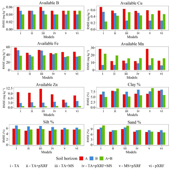 Root mean square error (RMSE) for available B, Cu, Fe, Mn, and Zn, and clay, silt, and sand fraction prediction models via random forest algorithm for A, B, and A + B horizons at a farmland scale in Brazil. TA—terrain attributes, pXRF—portable X-ray fluorescence; MS—magnetic susceptibility.