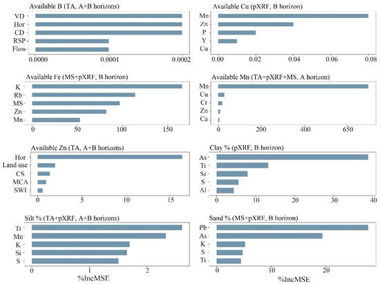 The combination of the six datasets [i: TA; ii: TA + pXRF; iii: TA + MS; iv: TA + MS + pXRF; v: MS + pXRF; vi: pXRF] and the data for A, B, or A + B horizons resulted in a total of 144 models for the prediction of the soil micronutrient availability and particle size fractions. The best models to predict available B, Cu, Fe, Mn, Zn, and clay, silt, and sand contents had their variable importance calculated by the percentage of increment of Mean Square Error (%IncMSE) and were chosen with deference to highest R2 and smallest RMSE. Figure 6 shows the five most essential variables per model.