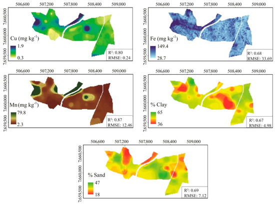 Given the aforementioned results, one can establish an ascending order of accuracy. Therefore, the groups are: (a) R2 ranging from 0.37 to 0.50 for available B (0.37), Zn (0.50) and silt (0.40) content; (b) R2 ranging from 0.60 to 0.70 for available Fe (0.68), clay (0.67), and sand (0.69) content; and (c) R2 ranging from 0.80 to 0.87 for Cu (0.80) and Mn (0.87) content. In digital soil mapping, accuracies of R2 > 70% are considered good results (although very difficult to be achieved); accuracies of R2 < 50% are more common [82,83]. Herein, at least one adequate predictive model was obtained for most soil attributes. Thus, the best models per soil attribute were used to generate spatial prediction maps.