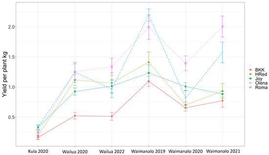 There were five cultivars that were common to 6 of the 7 iterations. When analyzed as a split plot with iteration (I) as the main plot and genotype (G) as the split plot, iteration, genotype and the I × G interaction were significant. When viewed by iteration (Figure 1), limited interaction between iteration and genotype was observed, with the exception of Olena, which occasionally changed ranks in each iteration. This suggests the interaction between genotype and environment is largely one of magnitude rather than direction. Across iterations, the standard cultivar ‘Hawaiian Red’ is generally a mid-level yielder (0.92 kg plant−1) with ‘Roma’ consistently yielding the highest (1.39 kg plant−1) and ‘BKK’ yielding the lowest (0.64 kg plant−1) (Figure 2).