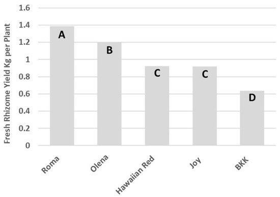 Fresh turmeric yield differed significantly among genotypes. Excluding the outlying MARC 2020 iteration, the overall yields observed in this work ranged 11.3–57.22 t ha−1 and generally agree with those in the literature. In a Nigerian trial of 15 accessions, fresh turmeric yields of 21.5–45.0 t ha−1 were reported [18], while another trial using organic production methods in India found the mean yield of improved cultivars (32.94 t ha−1) superior to local varieties (12.45 t ha−1) [19]. In a recent study, use of 25% shade netting increased turmeric yields from an average of 21 t ha−1 to 51–61 t ha−1 [20]. ‘Roma’ is the only genotype used in our trial that has yields reported elsewhere in the literature. In previously published studies, fresh ‘Roma’ yields range 10.2–21.6 t ha−1 [21,22,23], while we report yields of 27.9–57.2 t ha−1, excluding the outlying MARC 2020 ‘Roma’ yield of 5.20 t ha−1.