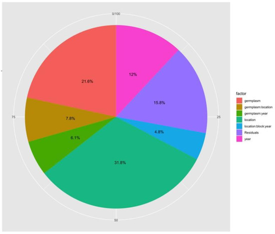 Yield error variance explained by each term in an AMMI model data across all genotypes and environments as analyzed using an R package, PPBstats 0.26 based on a Bayesian model [14].
