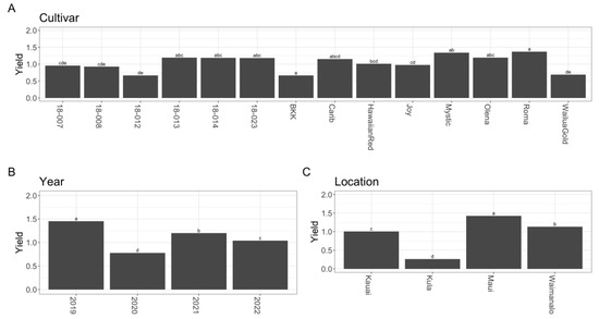 Yield (kg plant−1) comparisons based on a multivariate model accounting for the effects of (A) Cultivar, (B) year, and (C) location.