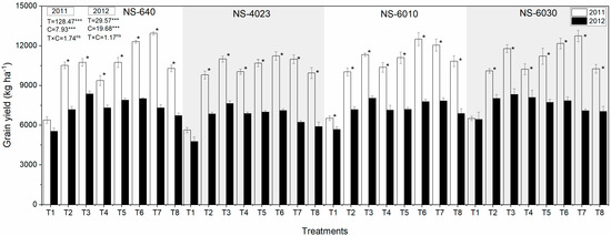 | 2012: T = 16.80 ***, C = 98.64 ***, T × C = 65.36 *** | 2012: T = 20.84 ***, C = 13.46 ***, T × C = 1.48 ns | |||||||||||||||