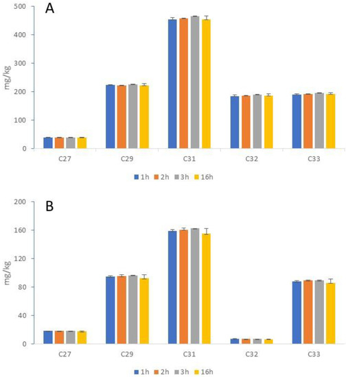 Using the lower sample loading (30 mg per mL for both faeces and herbage), we found that a lengthy over-night (or 16 h) saponification was not necessary, because no significant difference was observed in the yield of any of the n-alkanes (from C27 to C33) between 16 h and 1–3 h for both faeces and plant samples (Figure 1A,B). As the 3 h incubation gave a slightly higher overall yield of the major n-alkanes and the least variation between technical replicates, a standard 3 h saponification regime with a fixed sample to reagent ratio of 30 mg per mL was adopted for our miniaturised n-alkane analysis protocol.
