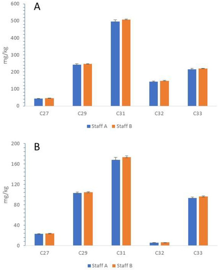 The reproducibility of our miniaturised method was assessed by comparing the results of two independent operators (named staff A and staff B) following the same protocol using the same faeces and herbage samples. For both operators the error bars (SD) of four technical replicates were rather small for all the major n-alkanes surveyed and for both sample types. The relative standard deviation (RSD) is generally used to evaluate the reproducibility of a method; RSD < 5% is considered to be satisfactory and RSD < 3% to be excellent, for biological samples. In this study, the average RSD was 2.7% and 2.4% for faeces and 1.5% and 1.9% for herbage (Figure 2A,B). In addition, there was no significant difference between the mean values (across all the n-alkane species and for both sample types) obtained by the two operators.