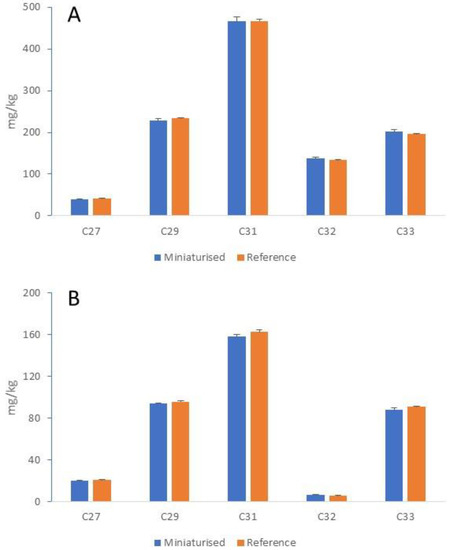 Both methods show a satisfactory reproducibility. Overall, the miniaturised method and the reference method produced very similar results with both the herbage and the faecal sample (Figure 3A,B); a slight difference observed in some cases was not statistically significant. This indicates that the miniaturised method is reliable for alkane analysis. The significantly reduced sample mass when using the ministurised protocol led to a substantial reduction in solvent consumption (a total of 10 mL vs. 32–46 mL hexane per sample for the reference method), a significant saving in SPE column cost (about 35%), and most importantly, a 3–4-fold reduction in the sample processing time (i.e., a 3–4-fold increase in sample throughput).