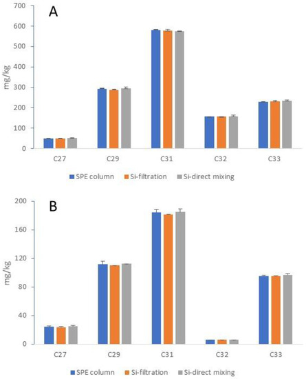 Comparison of three sample purification methods. Each column is the mean of two replicates and error bars are standard deviations (SD). (A): faeces; (B): herbage. Note: no significant difference was found for any n-alkane across the three methods (statistical symbols omitted).