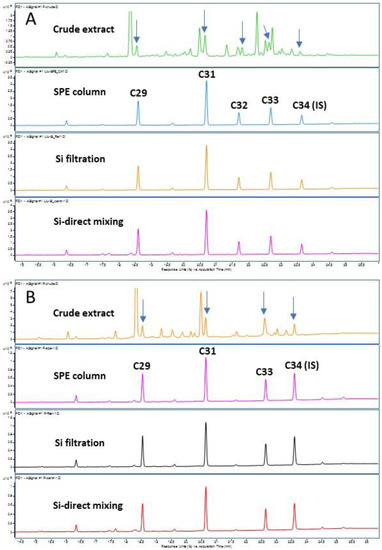 The GC-FID profiles of long-chain alkanes of the faeces and herbage samples before and after purification by the three methods are shown in Figure 5. While numerous interfering peaks which were not fully separated from the targeted alkane peaks were observed especially in the crude extract of the faecal sample, purification by filtration through silica powder or by directly mixing with silica powder generated a much cleaner alkane profiles for both sample types, very similar to those achieved by the commercial SPE column (Figure 5A,B).