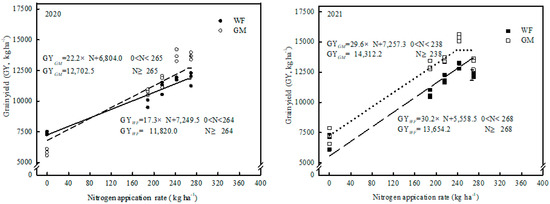 Numerous studies have shown that crops grain yied (GY) could be improved by about 30–50% attributed to N application [2,58], especially in North China Plain [59,60,61]. The present results indicate that N treatments always increased spring maize GY by 35.9–91.5% and 80.1–135.5% in two years, respectively (Figure 1). Meanwhile, the GY with N application reduced 10% to N243, averaged over two years were the highest at 11,775–13,682 kg ha−1 and 13,105–14,985 kg ha−1, respectively. In a recent study, spring maize GY under GM treatments (GYGM) were significantly increased by 5.38–11.68% compared to WF treatment (GYWF), which is supported by previous studies which reported that long-term use of astragalus smicus as green manure, can simultaneously improve double-rice GY and its stability [62], photo yield [23], and spring wheat GY in the Northwest China [25]. Generally, a linear-platform model has always been used for identifying the optimal N application for maximum crop yield [63]. In this study, we estimated an optimal N application rate of 264–268 kg ha−1 and 238–265 kg ha−1 for spring maize under WF and GM treatments, respectively. GY increased more under GM compared to WF (17.3–30.2 kg ha−1 vs. 22.2–29.2 kg ha−1), and maximum GY was 1820.0–13,654.2 kg ha−1 and 1270.5–14,312.2 kg ha−1 (Figure 1), which indicated that GM return little affected maize GY and N application rate reduction in the first year, but GY was increased significantly (14,312.2 vs. 13,654.2 kg ha−1) with N application rate reduced by 11.2% (238 vs. 268 kg ha−1) over two years. This agreed with previous studies reported that long-term use of astragalus smicus can change 0–40% N and K fertilizer in the early rice season and 0–20% N and K fertilizer in the late rice season [62], and replace N 11–32% in spring wheat systems [25], and even in different GM return years, increased total yield differently [23].