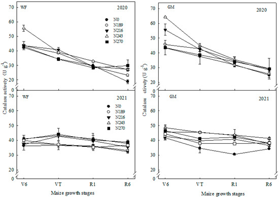 Specifically, compared to WF, the soil catalase activities (s-CA) were significantly increased by 9.3–16.4%, 6.2–9.3%, 10.2–12.6% and 4.9–8.9%, respectively, at four growth stages over all N application rates under GM over two years, which always significantly decreased with maize growth (Table 4 and Figure 2). During spring maize total growth duration, and s-CA were significantly increased, by 7.3–23.4% and 8.1–21.9% with N application, the rate increased more than N0 under WF treatments in 2020 and 2021, that for GF were 7.4–26.1% and 7.6–20.5%. Meanwhile, s-CA at N243 levels were the highest and had a significant difference to N189, no significant difference to N216 or N270 under WF and GM treatments over two years.