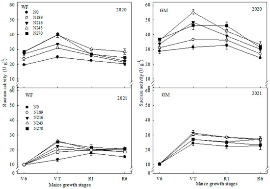 The soil sucrase activity response to N application under WF and GM treatments in the North China Plain. V6, spring maize jointing stage; VT, spring maize tasseling stage; R1, spring maize filling stage; R6, spring maize maturity stage.