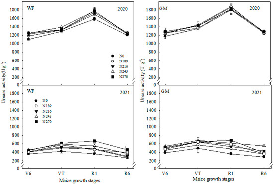The soil urease activity (s-UA) was extremely reduced in 2021 compared to 2020 (Table 4 and Figure 4). With spring maize growth, the s-UA performance increased initially and then decreased, and in 2020 the highest s-UA at the R1 stage was significantly increased by 28.6–42.4% and 30.5–47.7% compared to the V6, VT and R6 stages under WF and GM treatments. Meanwhile, in 2021 the highest s-UA at the VT stage was significantly increased by 6.1–57.4% and 13.8–42.1% compared to the V6, R1 and R6 stages under WF and GM treatments (Figure 4). In addition, s-UA for WF was significantly decreased compared to GM by 3.3% and 14.7%, 5.6% and 12.9%, 7.2%and 5.3%, and 3.0% and 21.5%, respectively, at four growth stages over all N application rates in two years (Table 3 and Figure 2). Over spring maize total growth duration, s-APA was increased with increased N application rate, and under WF treatment were significantly increased by 10.3–26.1% and 5.1–20.0% in 2020 and 2021 compared with N0, and those for GM were 1.9–13.7% (p < 0.05) and 3.9–21.8% (p < 0.05). However, only in 2021, were the s-UA at N243–N270 levels under WF significantly higher than N189 and N216 by 17.5–30.5% and 12.9–25.4%, while under GM treatments N243 was significantly raised by 31.9%,16.3% and 13.0% compared to N189, N243 and N270, respectively.