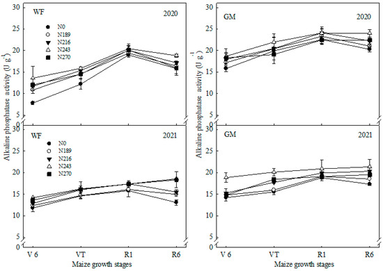 There were significant differences in soil alkaline phosphatase activity (s-APA) between the two study years (Table 4 and Figure 5). The s-APA performance increased initially and then decreased, with the highest values obtained at the R1 stage where significant rises of 17.6–77.3% and 5.0–29.4%, and 5.7–14.1% and 0.9–27.2% compared to the other three stages under WF and GM treatments over two years (Figure 5). Additionally, s-APA at V6, VT, R1 and R6 stages under GM treatments were significantly increased by 82.3% and 18.3%, 22.0% and 11.5%, 17.42%and 16.3%, and 29.6% and 19.8%, respectively, compared to WF over all N application rates over two years (Table 3 and Figure 2). With N application rate increased, s-APA were increased by 5.6–9.1% (p < 0.05) and 17.9–53.8% (p < 0.05), and 1.9–2.8% (p > 0.05) and 21.4–60.2% (p < 0.05) compared to N0 under WF and GM treatments over two years. Additionally, there were only significant differences between N243 and N189 under WF and GM treatments over two years.