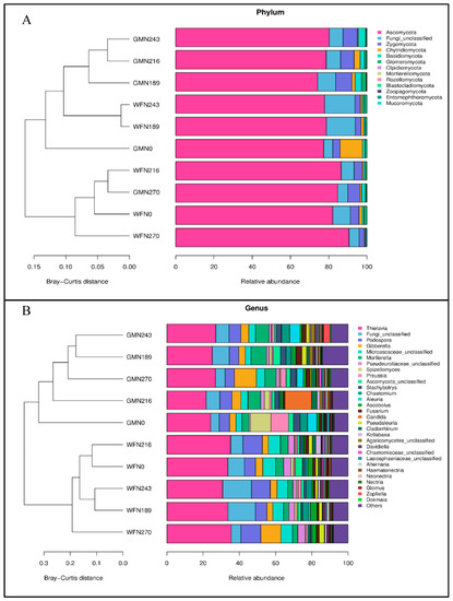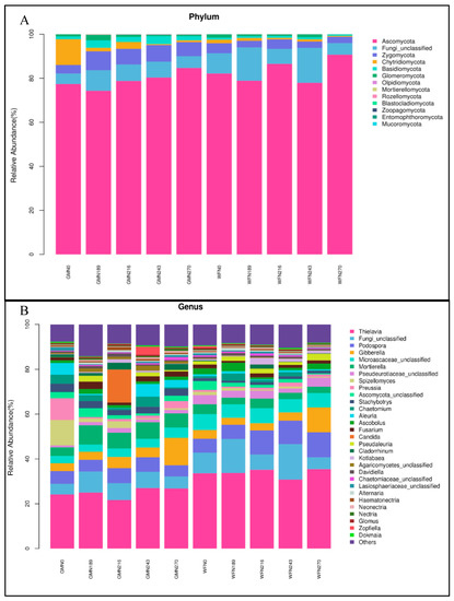 The soil fungal community’s response to N application under WF and GM treatments in the North China Plain. (A), Phylum level; (B), Genus level.