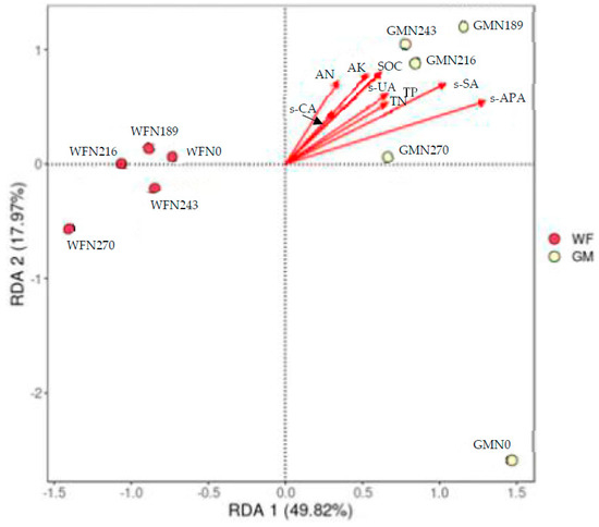 The redundant analysis (RDA) showed that the changes in the soil fungal community were explained to the greatest extent by soil enzyme activity, SOC, and TN, supporting similar conclusions of other studies [23,85]. In this study, soil fungal structures were significantly correlated with environmental factors across all treatments by the RDAs (Figure 8). For soil fungi, the first and second RDA axes explained 49.82% and 17.97% of fungal community variation, respectively. Nutrients release in soil from decaying SOC under GM increased soil enzyme activity [86], which was confirmed in a recent study showing that the s-CA, s-SA and s-APA as well as the SOC and TN levels, were significantly associated with fungal community variation. GM changes fungal communities, thus increasing enzyme activity [19,87], which could be attributable to the fact that GM and N provides an energy- and food-rich living environment for fungi [88,89], and in our study the N application rate significantly affected the fungal community at the genus level under WF treatments. Meanwhile, fungal community structures were significantly reduced with N application rate compared to N270 under GM treatments (Figure 8).