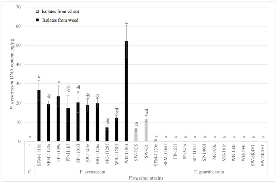 The DNA content of the pathogen F. avenaceum (F. avenaceum DNA pg/plant DNA µg) (±SEM) in spring wheat grains inoculated with different strains of F. avenaceum and F. graminearum from alternative host weeds and the main host wheat (values with different letters (a–f) indicate statistically significant differences (p < 0.05) between study treatments, C—water inoculated control).