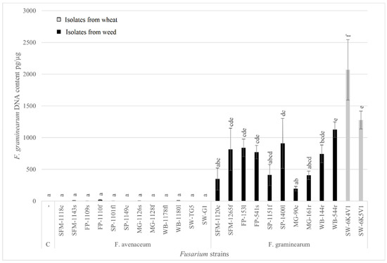 The DNA content of the pathogen F. graminearum (F. graminearum DNA pg/plant DNA µg) (±SEM) in spring wheat grains inoculated with different strains of F. avenaceum and F. graminearum from alternative host weeds and the main host wheat (values with different letters (a–f) indicate statistically significant differences (p < 0.05) between study variants, C—water inoculated control).