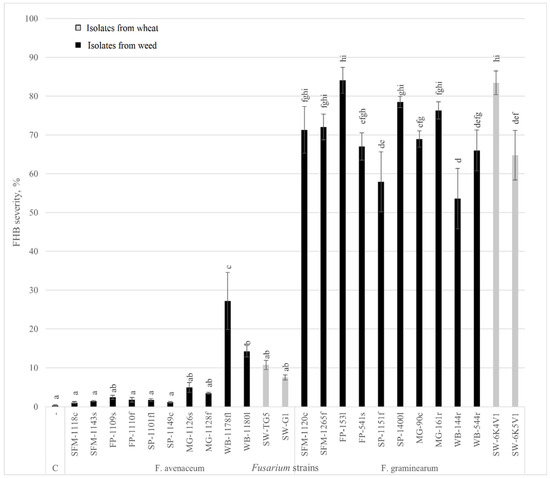 Fusarium head blight severity (FHB) in spring wheat heads inoculated with Fusarium isolates from weed and wheat (the percentage of FHB severity (±SEM) was calculated from the average of the four replications (20 heads per replication) inoculated wheat heads at 21 DPI. (Different letters (a–i) above the bars indicate statistically significant differences (p < 0.05) between study treatments. C—water inoculated control).