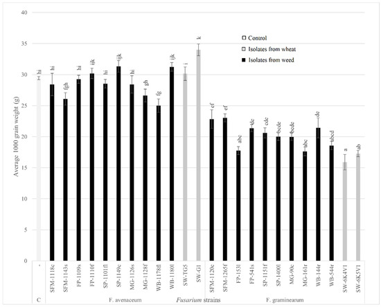 Average 1000-grain weight of spring wheat inoculated with different Fusarium strains isolated from alternative (weeds) and main (wheat) host plants (1000-grain weight was calculated based on the weight and number of grains per 20 heads). (Different letters above bars indicate significant (p ≤ 0.05) differences (a–k) within the control treatment and Fusarium strain inoculated treatments, and error bars indicate ±SEM. C—water inoculated control).